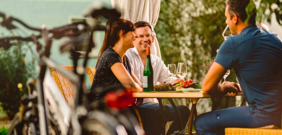 Drei Personen an einem Tisch bei einer Weinverkostung, im Vordergrund geparkte Fahrräder