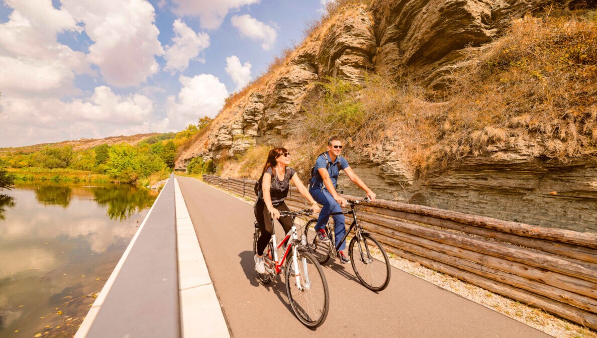 Zwei Personen fahren auf Fahrrädern auf einem asphaltierten Radweg vor einer Steinwand an einem Fluss entlang