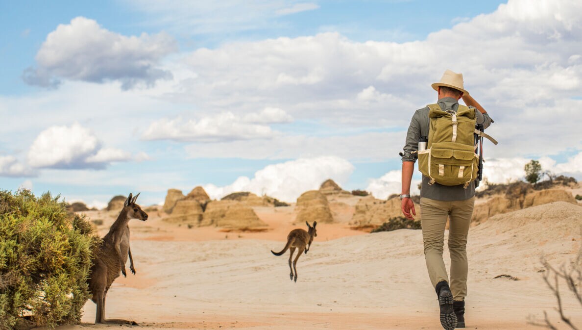 Rückansicht eines Mannes mit Rucksack, der durch eine Wüstenlandschaft mit Kängurus im Outback Australiens wandert