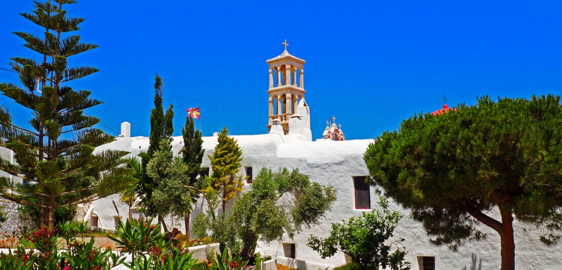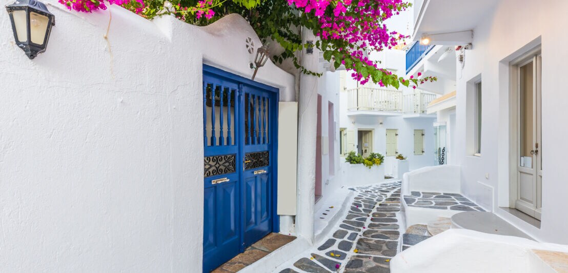 Ein besonderes Highlight von Mykonos-Stadt sind die Häuser im Stadtviertel Klein-Venedig. Sie gehörten im 18. Jahrhundert venezianischen Kaufleuten, viele bezaubern mit farbigen Holzbalkons und wurden direkt ans Meer gebaut. Die engen, labyrinthartigen Straßen sollten früher tatsächlich Piraten in die Irre führen. Heute ist es ein Vergnügen, sich in ihnen zu verlieren und dabei eine Galerie, ein Souvenirgeschäft oder auch eine Bar mit Meeresblick zu entdecken.