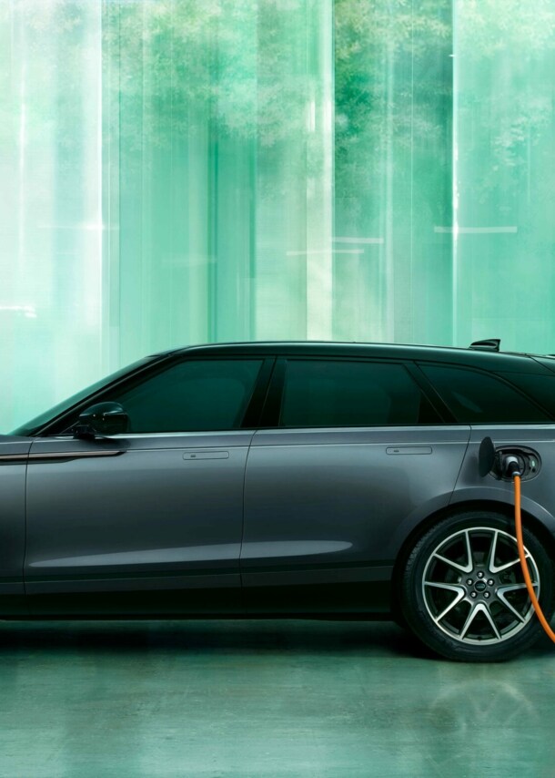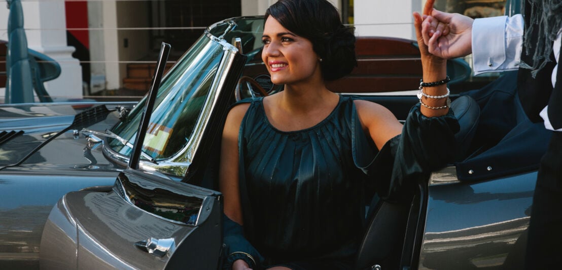 Eine Frau im langen Kleid und einem Weinglas in der Hand steht in einer Suite und blickt hinaus durch eine geöffnete Terassentür mit wehenden Gardinen.