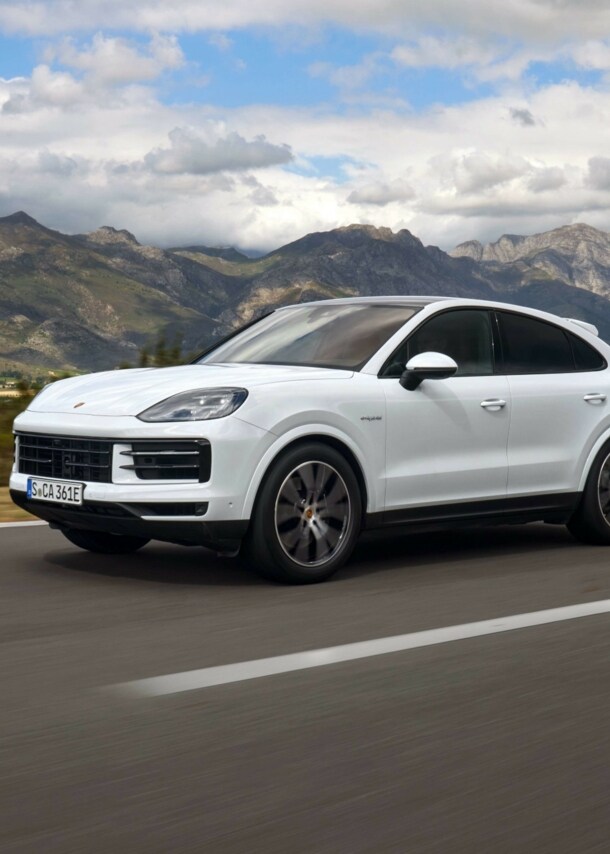 Luftaufnahme einer weiten Winterlandschaft mit schneebedeckten Wäldern, durch die ein einzelnes Auto über eine Straße durch den Schnee in der Abenddämmerung fährt