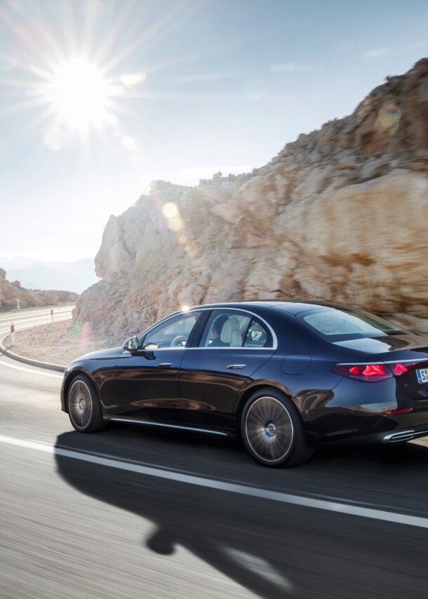 Eine lachende Frau in orangefarbener Bluse sitzt auf dem Rücksitz eines Autos mit einem aufgeklappten Laptop auf ihrem Schoß.