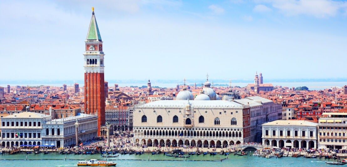 Fünf Kuppeln thronen auf dem Dach des Markusdoms, sein Inneres ist geschmückt mit zahlreichen Mosaiken, Gemälden und Altären. Vor der berühmten Basilika ragt zudem der Campanile empor: Der Glockenturm ist mit knapp 100 Metern das höchste Gebäude der Stadt und ihr Wahrzeichen.