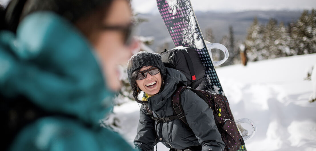 Eine lachende Frau in Winterkleidung mit einem Rucksack und einem Snowboard auf dem Rücken in einer Schneelandschaft