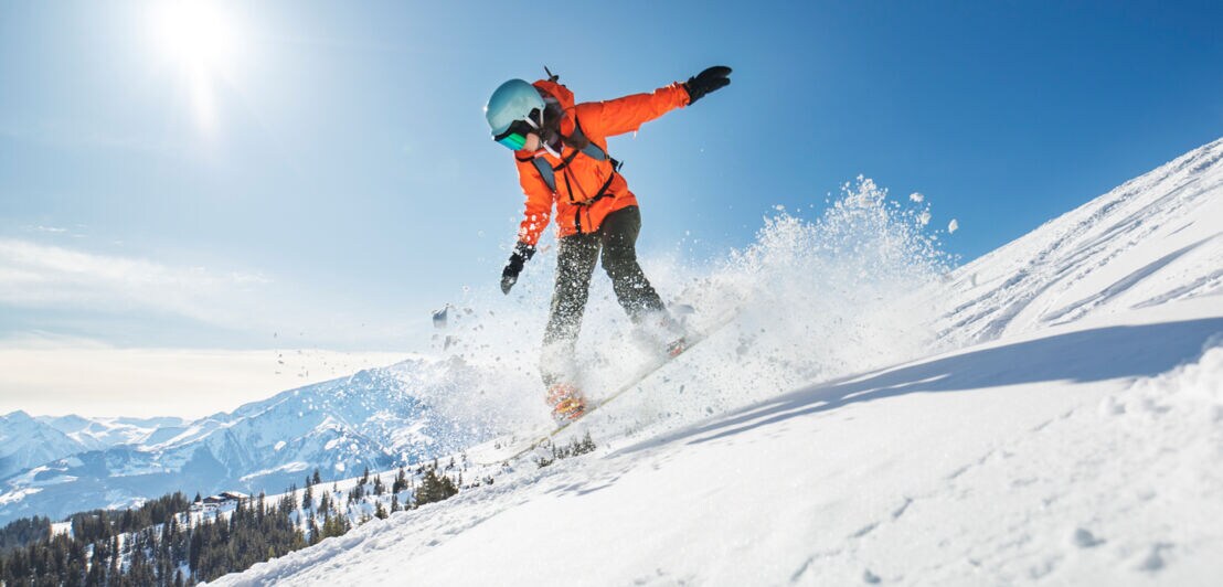 Eine Snowboarderin mit Helm fährt bei Sonnenschein einen Berghang hinunter