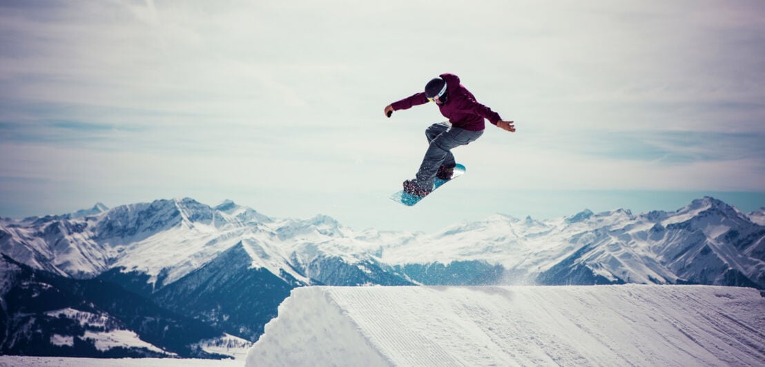 Ein Snowboarder springt über eine Schneeschanze vor Bergpanorama