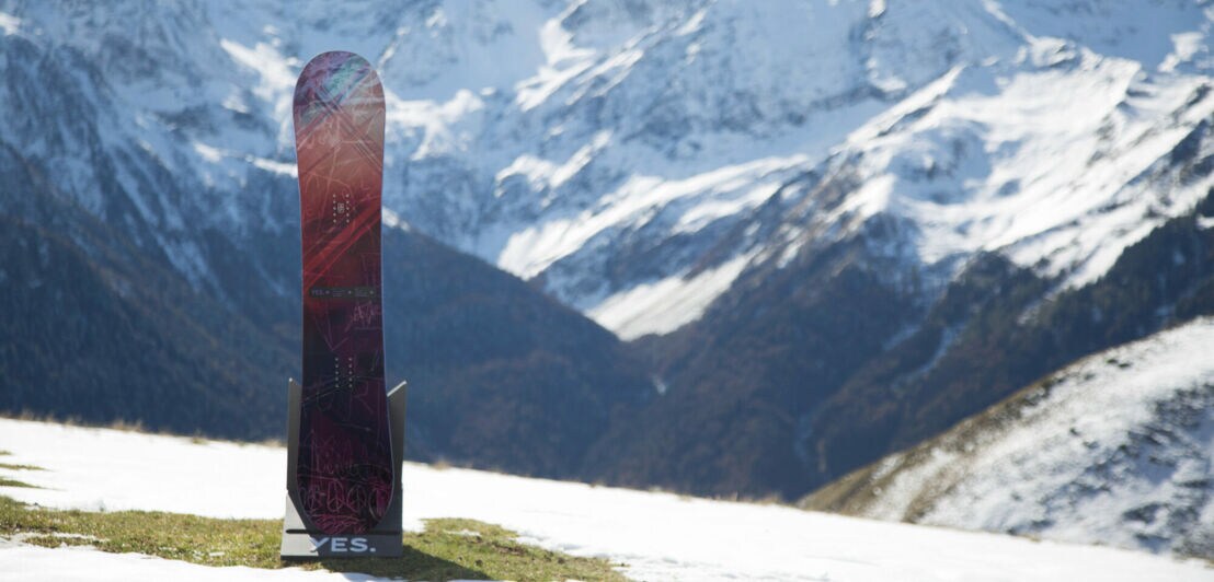 Ein Snowboard der Marke YES steht senkrecht vor einem Bergpanorma