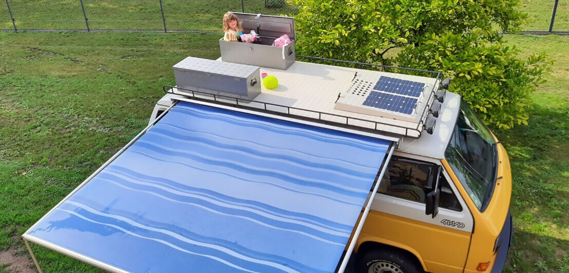 Doch das sind noch längst nicht alle Highlights seines VW-Bus-Ausbaus, auf die Sebastian stolz ist. Was hat der T3-Syncro noch zu bieten? „Ich habe immer ein Notebook mit Beamer dabei. An unserer Markise kann ich eine Leinwand anhängen und schon beginnt unser Kinoabend.“