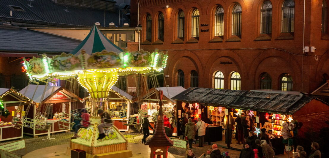 Kinder vergnügen sich auf dem Kettenkarussell oder der Sternenleiter oder können dem Weihnachtsmann täglich von 17 bis 18 Uhr begegnen. Neben den nordischen Attraktionen macht die besonders kuschelige Atmosphäre in den Höfen der ehemaligen Brauerei den Reiz dieses Weihnachtsmarkts aus.
