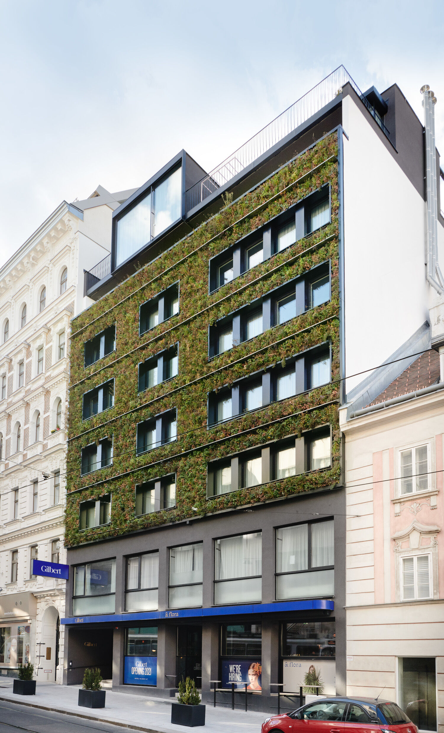 Das Hotel Gilbert, das 2022 eröffnete, setzt bereits von außen Akzente: Die gesamte Fassade ist begrünt. Und das hat nicht nur optische Gründe. „Schädliche Luftinhaltsstoffe und Staub werden vom dichten Laub festgehalten. Sie stellen also eine natürliche Luftreinigungsanlage dar, produzieren noch dazu Sauerstoff und binden Kohlendioxid“, erklärt Hotelmanagerin Astrid Kahl-Schaban.