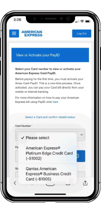Your unique American Express Card PayID is located on your Card statement or by logging into your Online Account, selecting the ‘Payments’ tab and clicking on ‘View or Activate your PayID’.