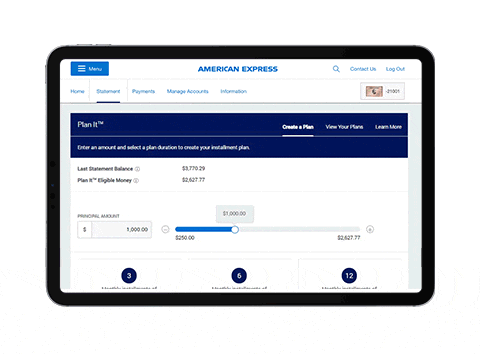 11. Your ability to create each new installment plan will depend on an assessment of eligibility made at the time you seek to create an installment plan. In order to create a new installment plan, your account must be in good standing and you must have a minimum $100 purchase or statement balance on your eligible Card. Any transactions related to funds advances and balances at special rates of interest will not be eligible unless we make a special offer to you. We may also limit or otherwise restrict your ability to participate in the installment program based on your account's available credit or for any other reason. Please see the Plan It (American Express