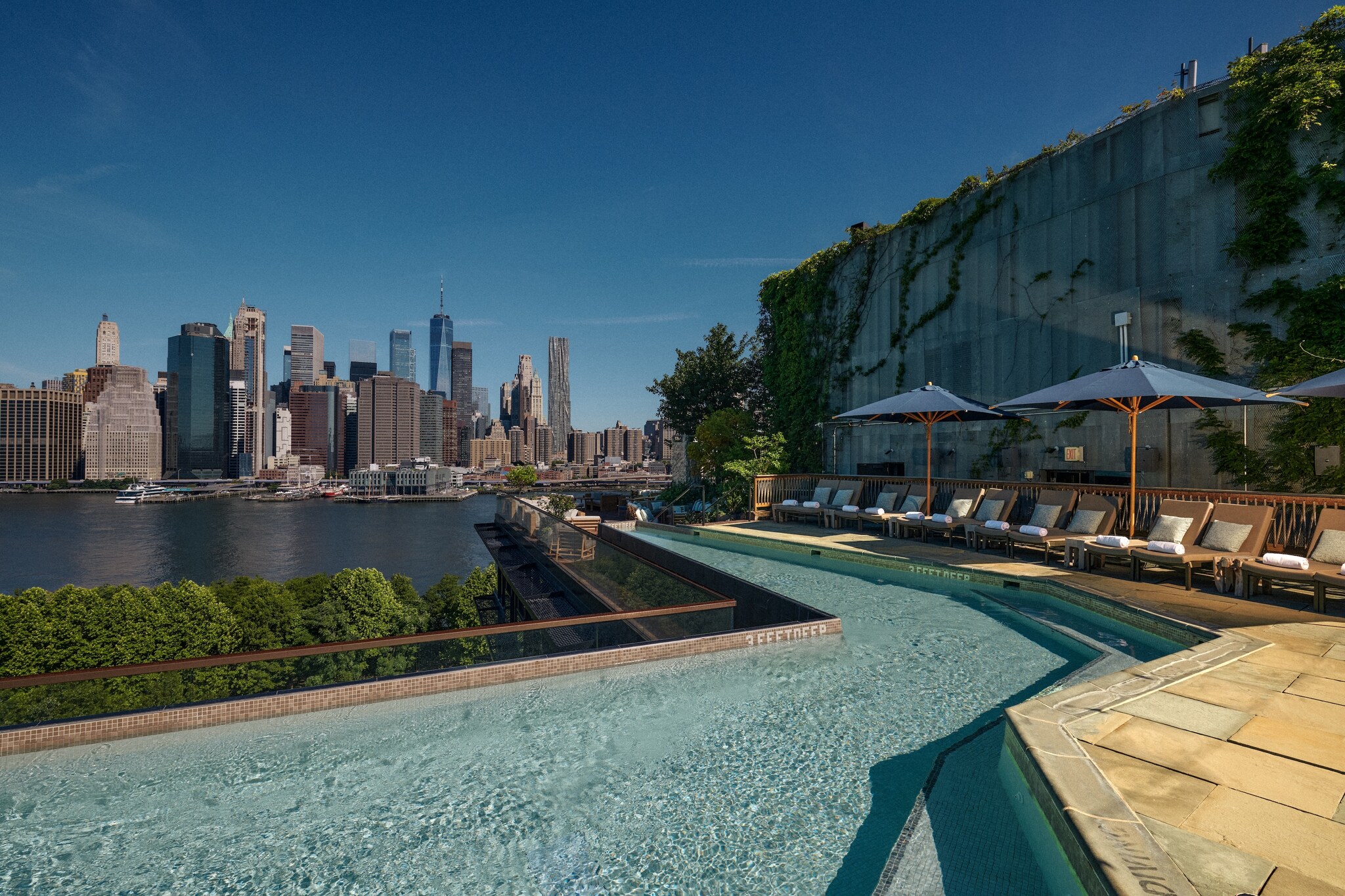 Take in sweeping views of the city that never sleeps from this boutique hotel that invites guests to slow down and take it easy. Located on the edge of Brooklyn Bridge Park, 1 Hotel Brooklyn Bridge features a rooftop pool with vibrant plants and trees that stand in contrast to Manhattan’s steel-and-glass skyline beyond. The L-shaped pool area has comfy loungers and table seating where you can relax and enjoy a menu of cocktails and light bites.