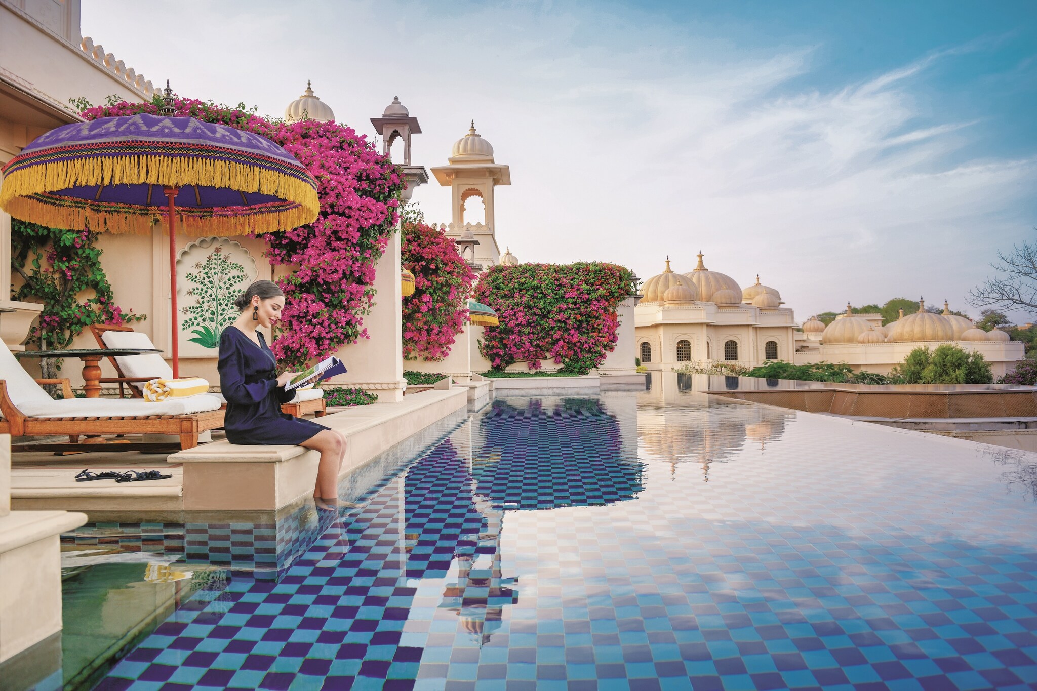 Found within Rajasthan, a region known for its ornate royal palaces, Oberoi Udaivilas channels that regal aesthetic throughout 30 acres of courtyards and rooms marked by opulent furnishings. It counts not one but nine swimming pools – notably, a long, rectangular pool with a black-and-white checkered border. Select luxury suites give guests access to stroll outside their accommodations directly into marbled private pools with accompanying open-air dining spaces. Families will appreciate the hotel’s full slate of experiences for all ages, including traditional boat rides and private cooking sessions.