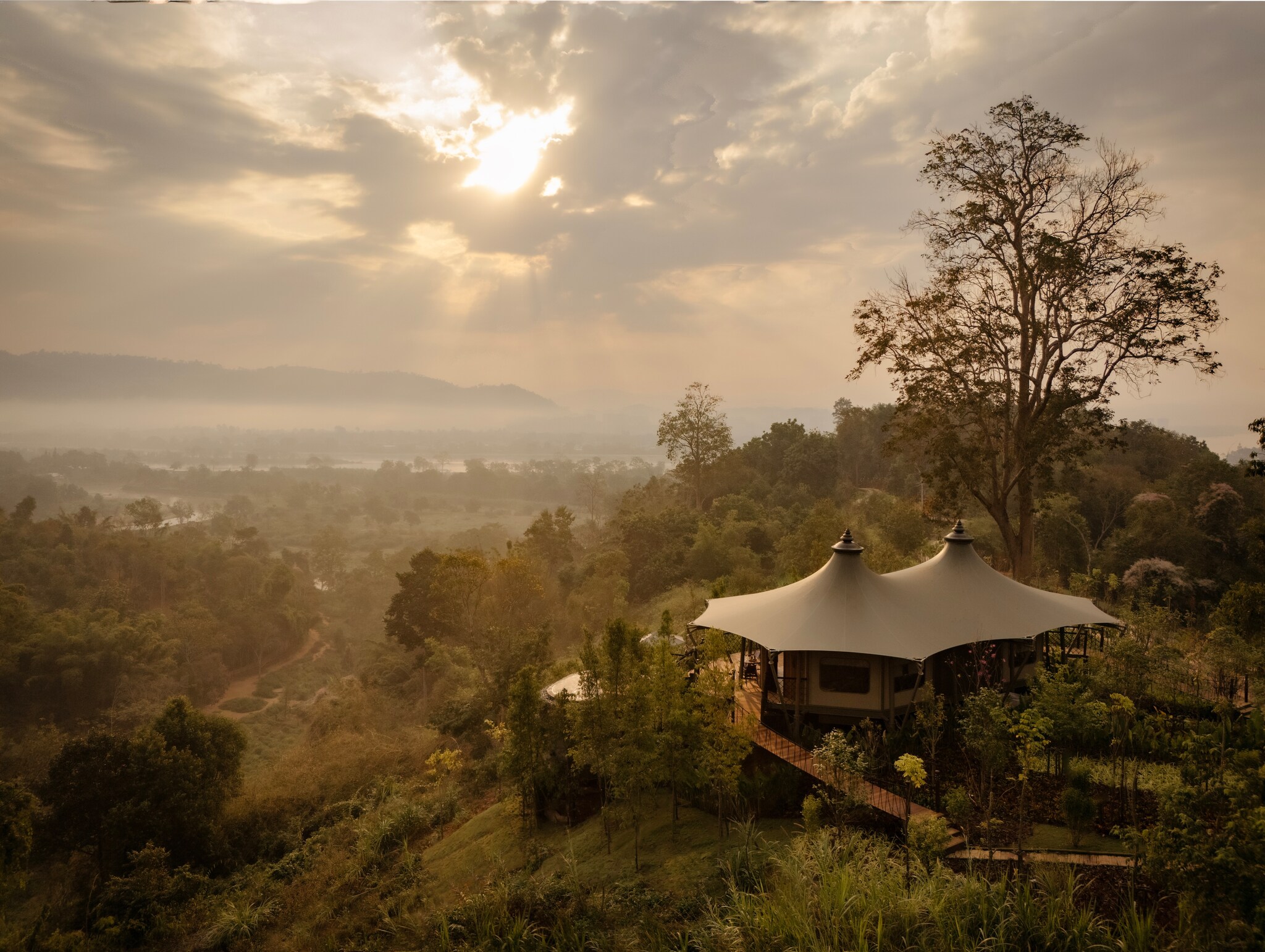 Your fellow guests include the resident elephants at Anantara Golden Triangle Elephant Camp and Resort, a resort and elephant sanctuary sitting atop a jungle ride in the Golden Triangle (the spot where the borders of Myanmar, Thailand, and Laos meet). Surrounded by a bamboo forest where the elephants roam free, the resort’s suites feature teak and silk furnishings, indigenous artwork, and private balconies with daybeds from which you can enjoy unique vistas of all three countries in the Golden Triangle. Be sure to take part in a special private dining experience – you can delight in a designer dining or elevate the experience with Canopy, a Treetop Dining Experience – or spend a night observing the elephant from your bed in the two-bedroom Jungle Bubble Lodge, large glass spheres offering 360 views of the gentle giants. For a truly elevated glamping experience, the newly introduced Mekong Explorer Tent sits high on the hillside with a private infinity pool, outdoor bathtub, and Explorer Arrival via traditional longtail boat—it seamlessly combines luxury with immersive nature and unparalleled views of the Mekong and elephant sanctuary.