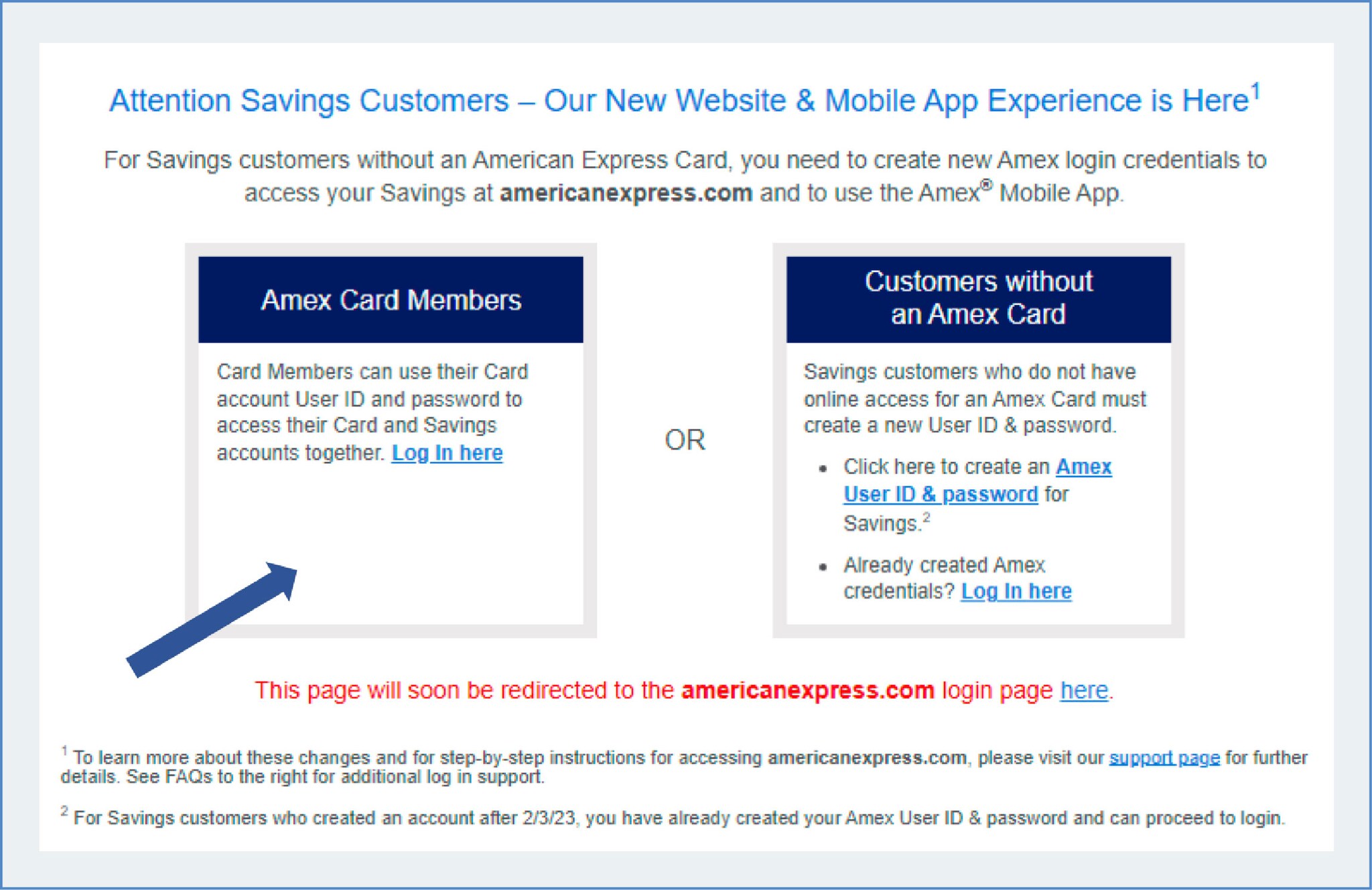 If you created your online account prior to 2023 and you have not logged into your account recently, you may need to update your credentials. To learn more about updating your American Express® Savings online account access, follow the instructions below.