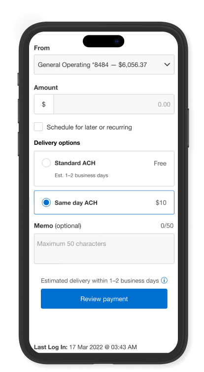 Set up one-time or recurring Bill Pay and ACH payments for now or later, so you can get back to business.