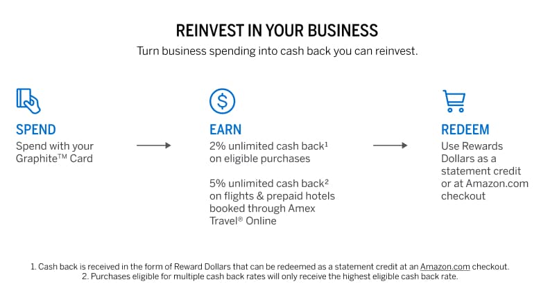 Basic Card Members will earn Reward Dollars (Reward dollars) for eligible purchases on their Graphite™ Business Cash Unlimited Card (Card Account). The number of Reward dollars earned is based on a percentage of the dollar amount of their eligible purchases during each billing period. Basic Card Members will earn a reward of 2% on all eligible purchases. Eligible purchases are purchases for goods and services minus returns and other credits. Eligible purchases do NOT include fees or interest charges, purchases of travelers checks, purchases or reloading of prepaid cards, or purchases of other cash equivalents, gift cards, or person-to-person transactions, or any portion of a purchase that is covered by Reward Dollars at point of sale. Basic Card Members can redeem Reward dollars for statement credits or for eligible items at Amazon.com checkout, with no minimum redemption amount. Basic Card Members cannot use cash back to pay their New Balance (or Minimum Payment Due or Amount Due, if applicable) on their most recent billing statement. Statement credits, or any reversals of a statement credit, may be applied to either their Pay Over Time balance or Pay In Full balance, at our discretion. The Basic Card Member must link their Card Account to their Amazon.com account in order to use Reward dollars at Amazon.com. When a Basic Card Member uses Reward dollars at Amazon.com, we will charge their Card Account for the purchase, deduct the Reward dollars from the available Reward dollars on their Card Account, and apply a credit to their Card Account to reflect the Reward dollars used. In addition to these Terms and Conditions, the terms and conditions for Shop with Points at Amazon.com apply to eligible purchases made with Reward dollars at Amazon.com.