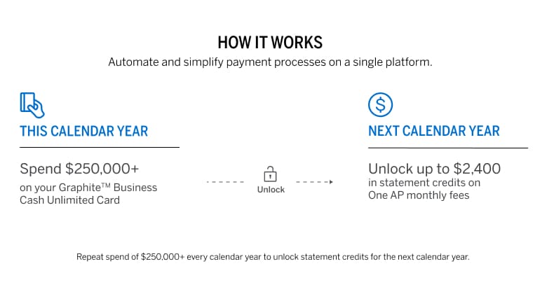 Unlock up to $2,400 in statement credits for use in the next calendar year on American Express One AP® monthly fees*** after you spend $250,000 on eligible purchases on the Graphite™ Business Cash Unlimited Card in this calendar year.**** Statement credits will be applied to your monthly bill charged to the Card for our accounts payable solution, One AP. Terms apply.7