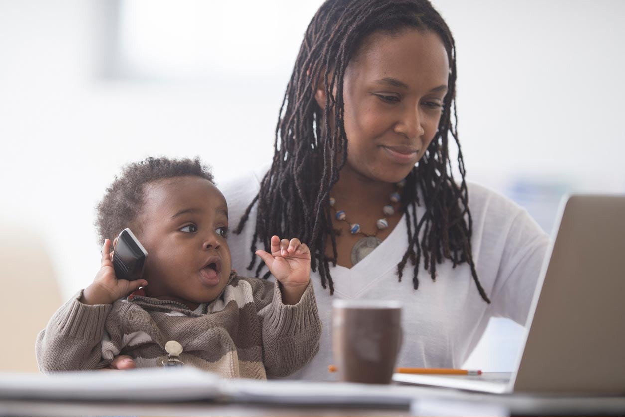 Woman looking at a laptop with a baby that's holding a phone sitting on her lap