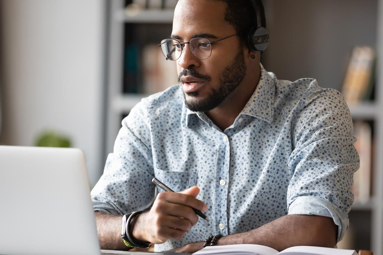 A man with headphones and glasses is focused on his laptop, engaged in work or research related to savings bonds.