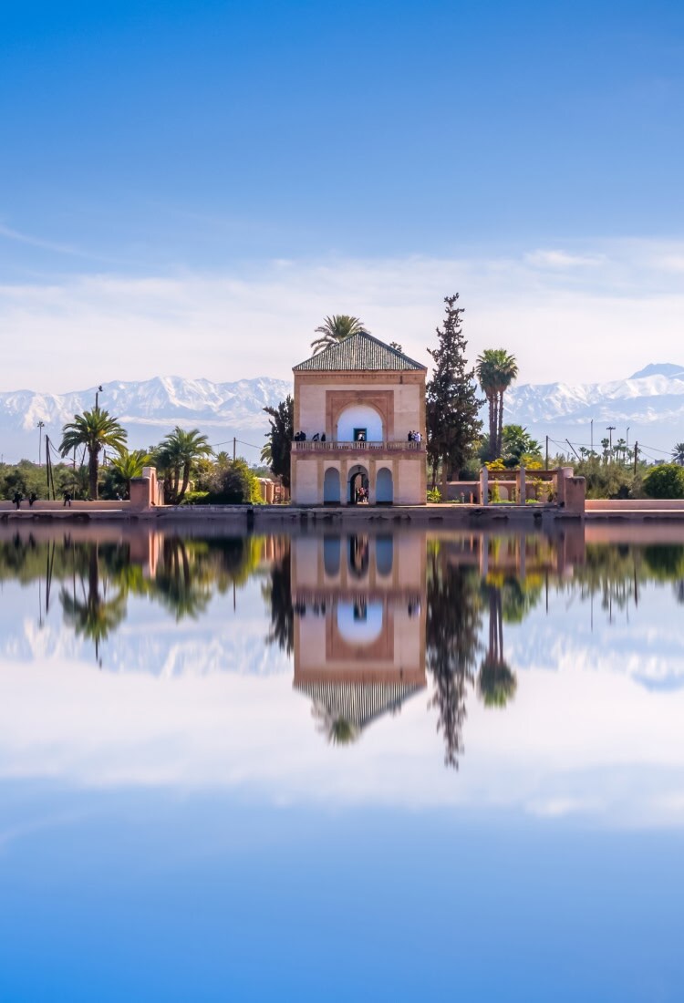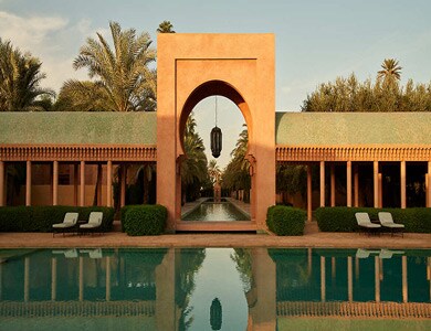 Just outside Marrakech, Amanjena draws inspiration from the rose-hued buildings of the Medina and the 12th-century Menara Gardens of the Red City. The palatial property features a central reflection pool that connects the shady garden courtyards and is bordered by spacious standalone Pavilions and Villas. The Moroccan Restaurant serves authentic local cuisine, blending Berber, Andalusian and Mediterranean influences, while Arva takes inspiration from the traditions of Italian cooking. Other facilities include a two-story wellness center with a gym and a yoga studio.