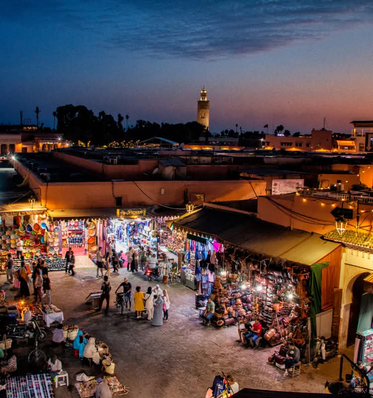 One of the city’s most famous landmarks is the historic 12-century Koutoubia Mosque, its Moorish minaret visible from most parts of Marrakech. At the heart of the city rests Jemaa el-Fnaa Square, a lively center for musicians, vendors, and food, day or night.