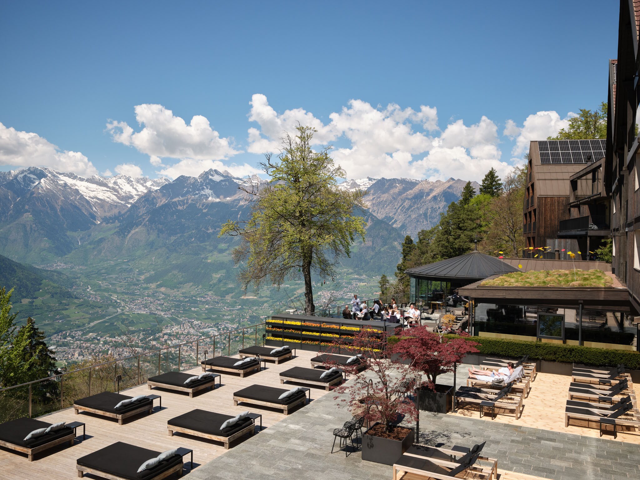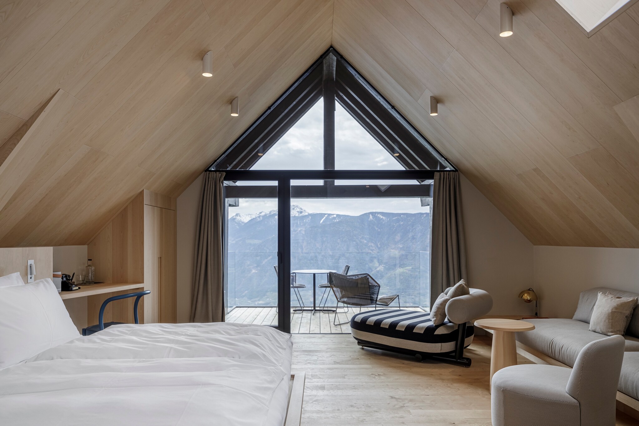 This boutique hotel in Italy’s Dolomites mountains overlooks the small town of Merano from its perch on a sunny mountain plateau with v snow-capped Alpine peaks in the distance. The crowning jewel is its distinctive infinity pool that hangs over the valley below; you’ll feel as if you’re swimming in the air. Elegantly minimalist rooms feature floor-to-ceiling windows, balconies, and interiors of wood and stone. The dedicated concierge will help coordinate activities, anything from forest bathing to wine tastings to a ride in the hotel’s vintage Alfa Romeo.