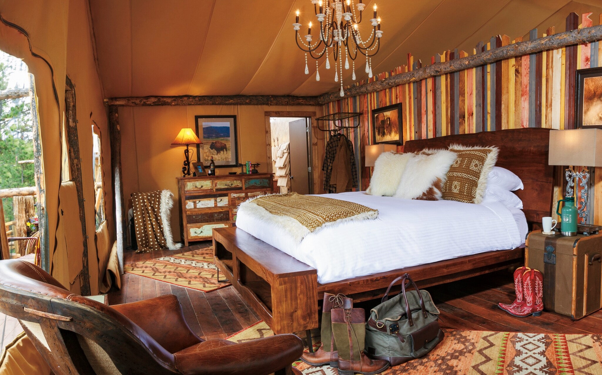 In the pastoral backcountry of western Montana, experience Paws Up, an elevated luxury dude ranch located on a 37,000-acre working cattle ranch. Fully furnished cabins of varying sizes feature full kitchens, fireplaces, and wood burning stoves. In the warmer months, you can opt to stay in an on-property luxury safari tent. Whatever the season, there are activities that will get your adrenaline pumping outdoors, among them, fly-fishing, mountain biking, dog sledding, and river rafting.