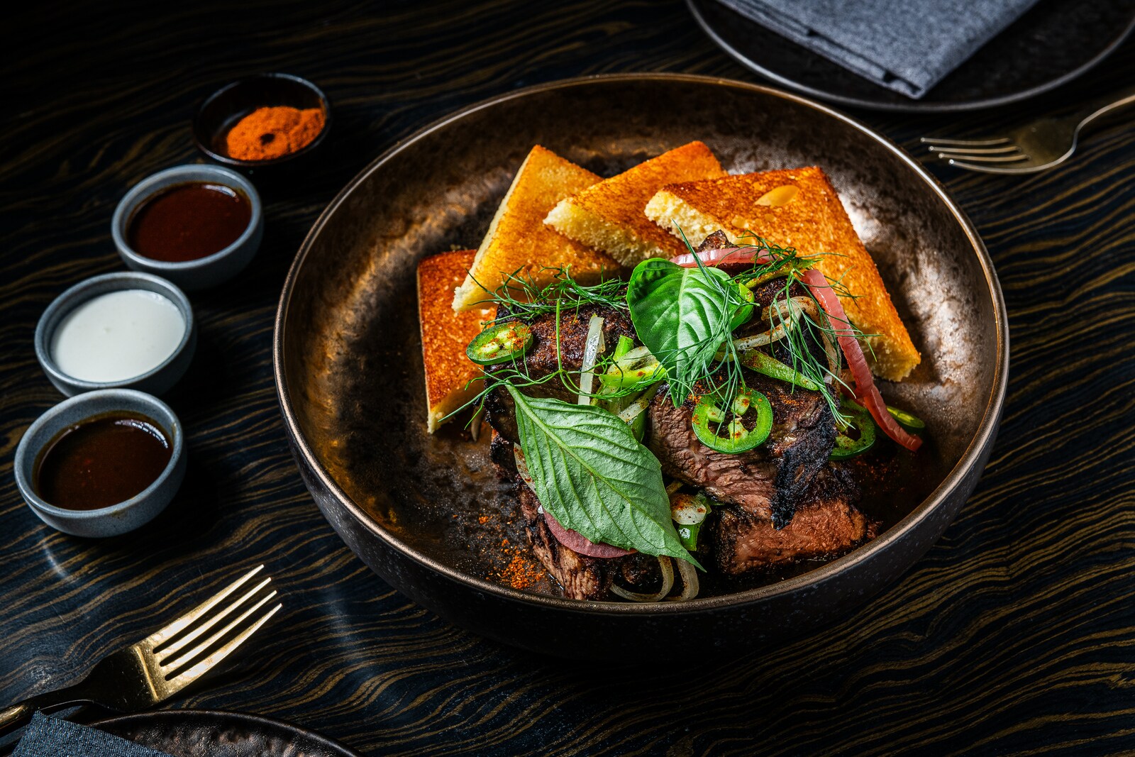 Situated in the Salamander Hotel, the sleek, moody interior of Dōgon by Kwama Onwuachi brings diners’ attention unerringly back to the stunning menu. Onwuachi brings his award-winning chops and a range of influences from his Afro-Caribbean heritage to bear on everything from chicken with jollof rice to wagyu short rib awaze and craveworthy coco bread.