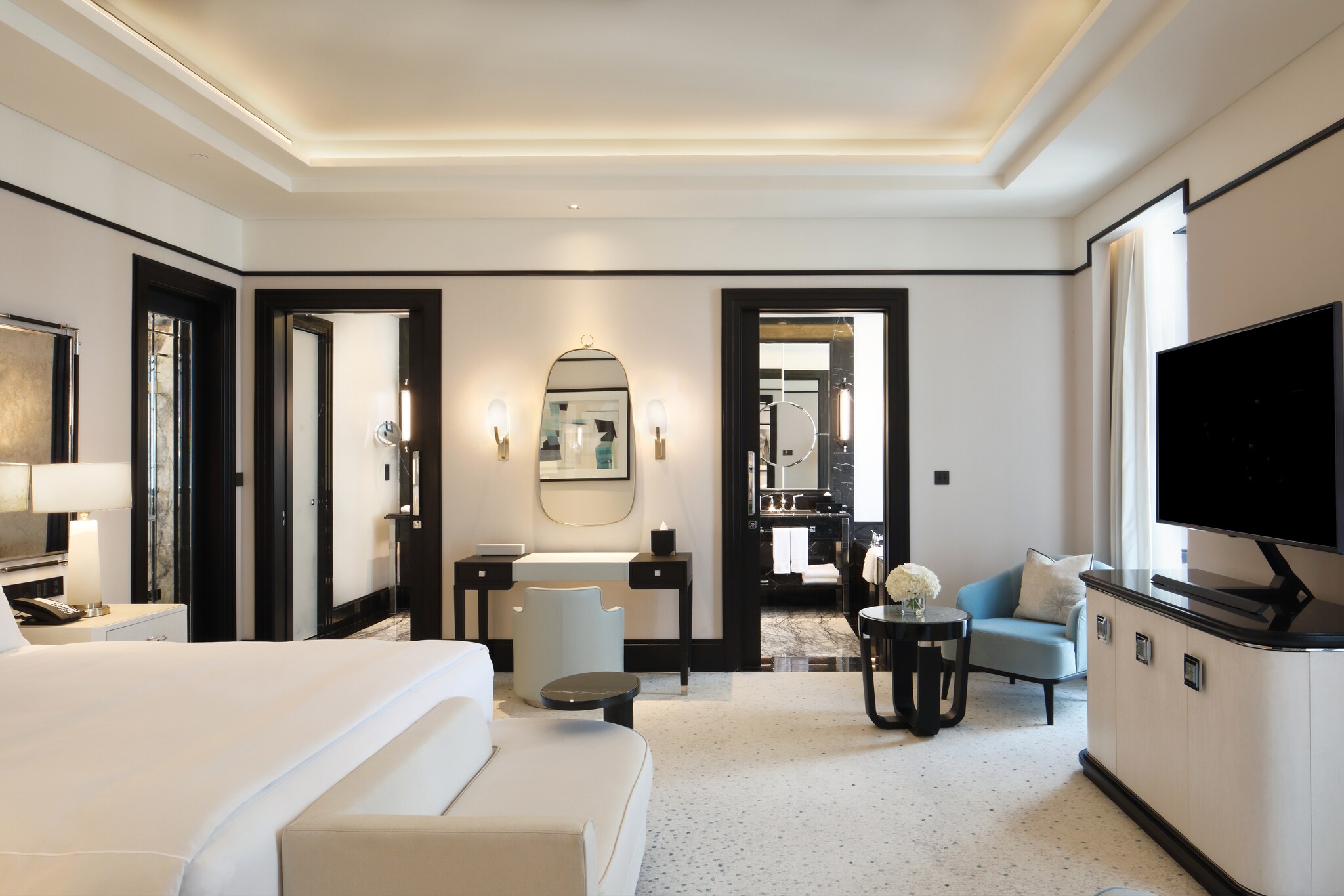 - The vibe: Polished and sophisticated, with nods to the flagship Waldorf Astoria New York (there’s a giant Tiffany clock in the lobby). Art Deco-inspired suites have monochromatic black-and-white décor and floor-to-ceiling windows with bird’s eye city views.