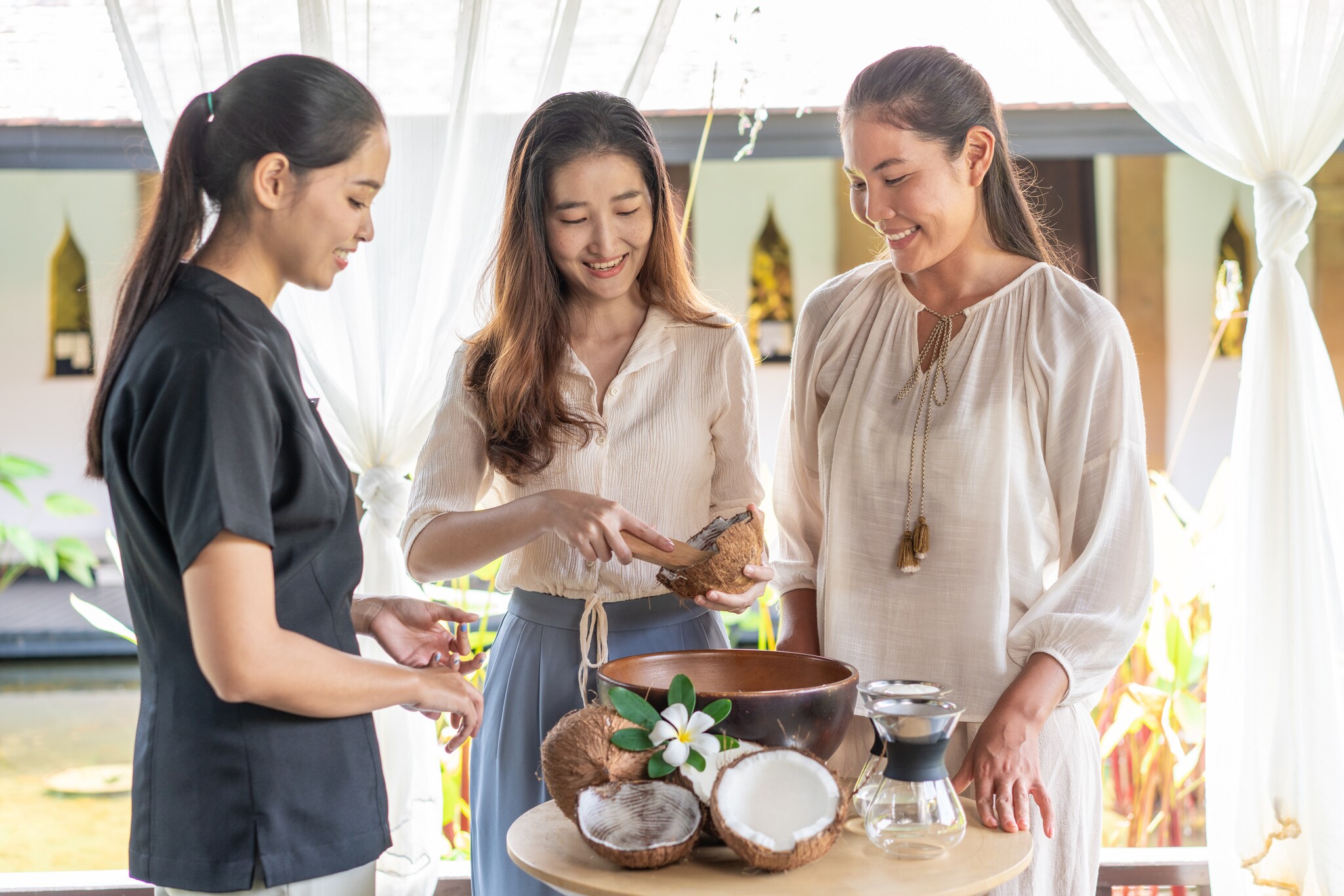 The JW Garden is a serene sanctuary that delights guests and grows indigenous herbs that are prominently featured at the resort experience, from the welcome cocktail to fragrant restaurant meals, spa treatments, and even turn-down amenities. Signature herbs including lemongrass, Thai basil, and roselle are all grown on-site, reducing reliance on the supply chain. Locally sourced coconuts can also be found throughout the hotel. From coconut milk cocktails by the pool, coconut oil and scrub treatments at the spa, grated coconut toppings on ice cream, to coconut shell plant pots in the garden — the resort has found a way to maximize the use of this local fruit.