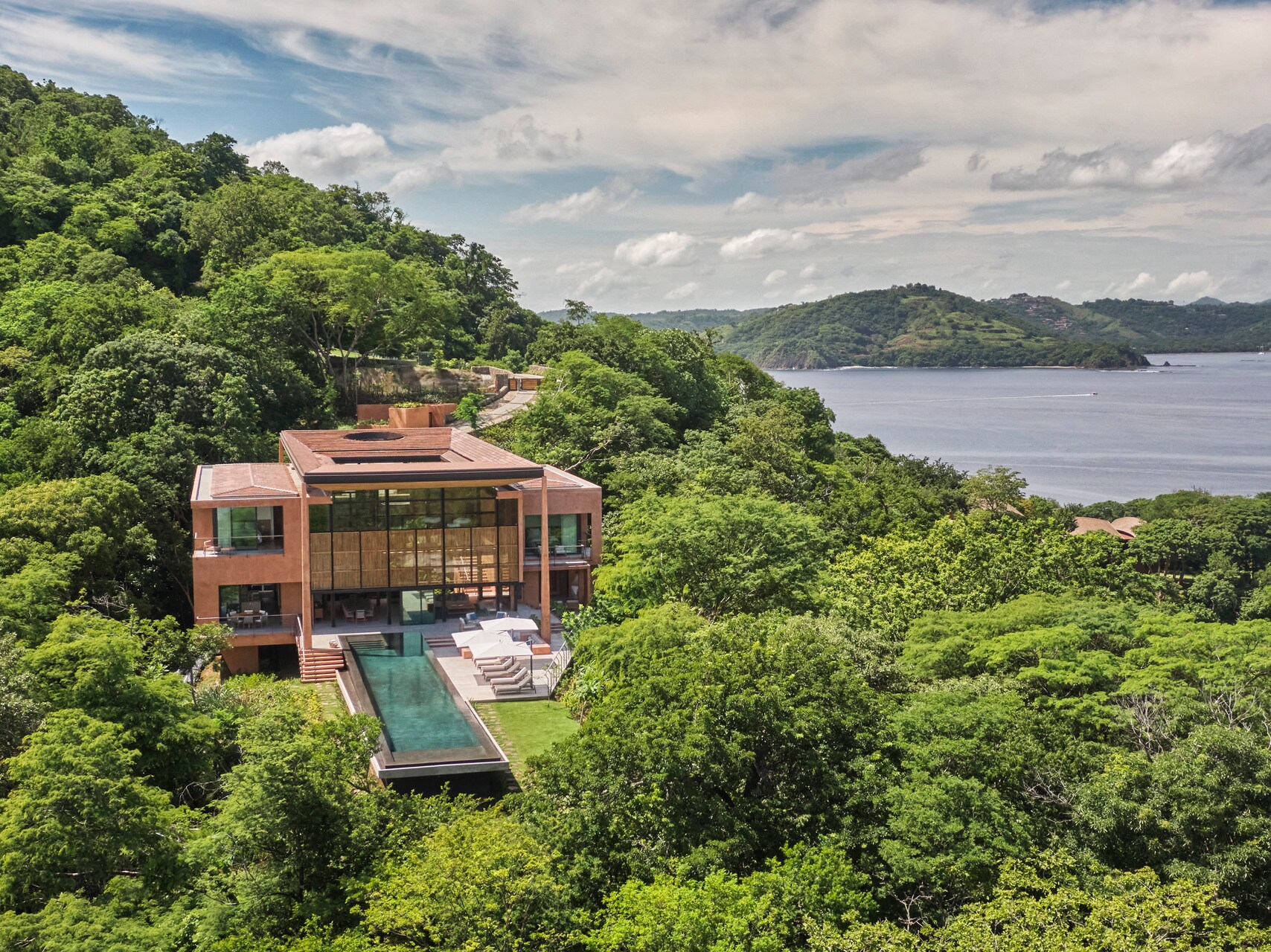 Nayara Tented Camp was specifically designed with the goal to have a light environmental footprint on its rainforest property. Each structure was built as a modular kit on stilts, using eco-conscious materials such as bamboo and local Tekal stone, energy-saving lighting, and natural hot springs to feed the plunge pools. The tents are elevated and open, immersing guests in the surroundings and maximizing the effects of sunlight and ventilation to reduce heating and cooling needs.