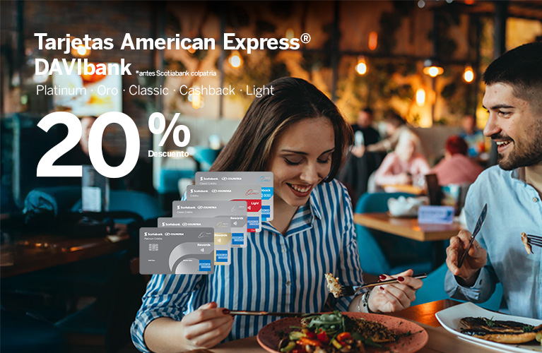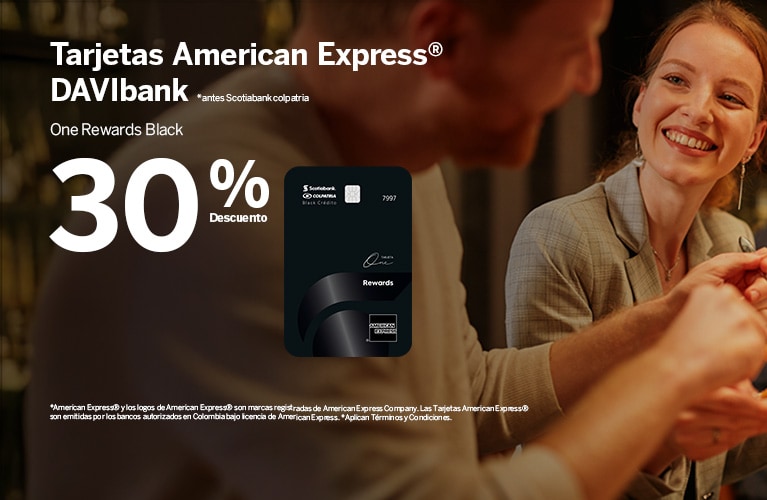 - Beneficio exclusivo para pagos con Tarjetas American Express® emitidas en Colombia; los bancos emisores en Colombia son Bancolombia y DAVIbank antes Scotiabank Colpatria.