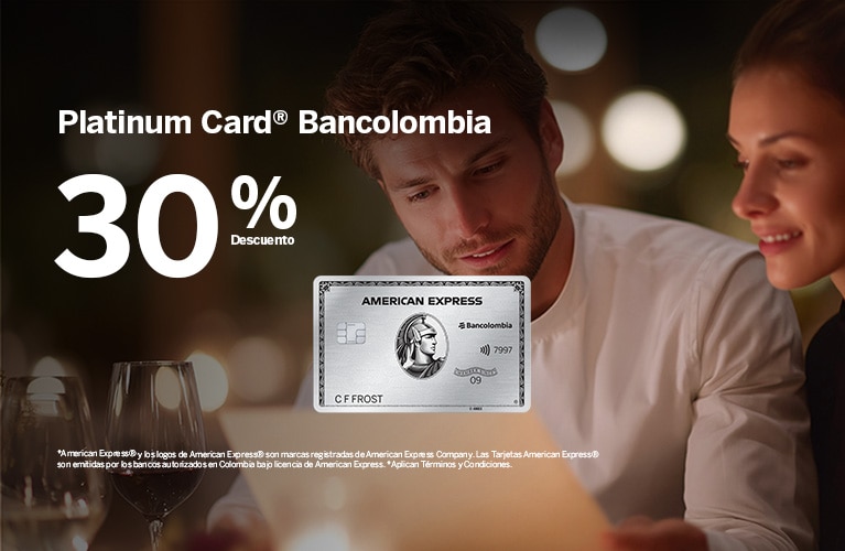 - Hasta 30% de descuento al realizar el pago con la tarjeta Platinum Card® de Bancolombia (BIN*/primeros 6 dígitos 377814) y la tarjeta One Rewards Black American Express® DAVIbank antes Scotiabank Colpatria (BIN*/primeros 6 dígitos 379353) en los restaurantes paticipantes.