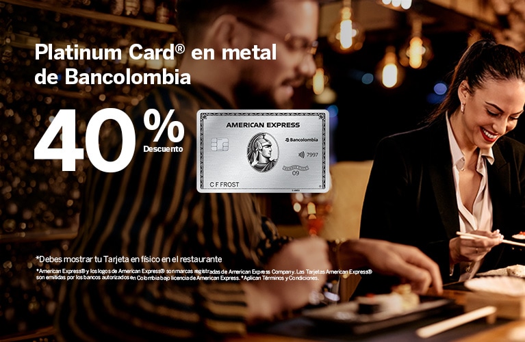 - Hasta 40% de descuento al realizar el pago con la tarjeta Platinum Card® en Metal de Bancolombia (BIN*/primeros 6 dígitos 377843); para este caso, el cliente deberá presentar la tarjeta física Platinum Card® en Metal de Bancolombia en los restaurantes paticipantes.