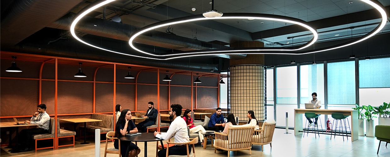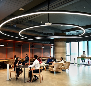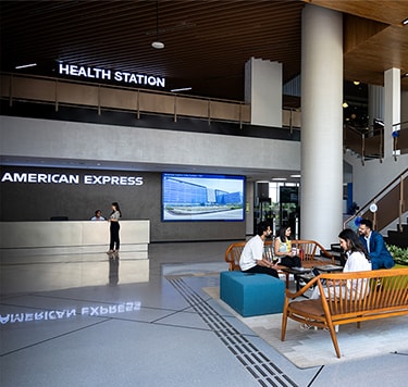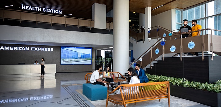 El campus vanguardista de American Express en Gurgaon, India, ocupa casi un millón de pies cuadrados y ofrece un espacio de trabajo moderno y eficiente en materia de energía que permite a nuestros equipos impulsar la innovación y ofrecer un servicio excepcional a nuestros clientes. El impresionante campus ejemplifica un enfoque avanzado del diseño del lugar de trabajo, que promueve el movimiento, el bienestar de los colegas y un sentido de comunidad.