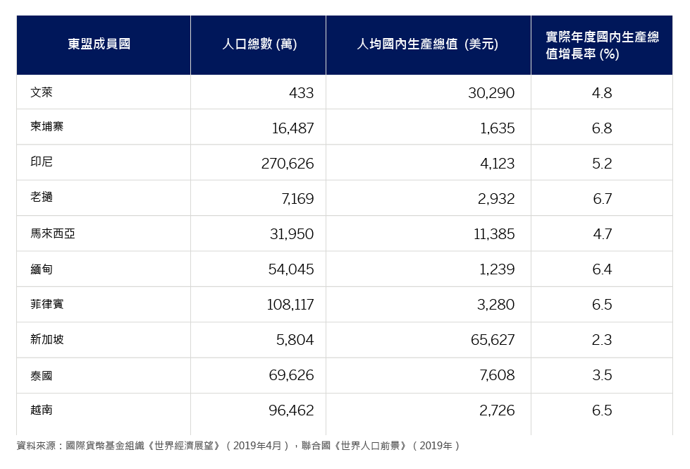 根據香港貿易發展局(貿發局)的研究,東盟是一個收入和消費力不斷增長的龐大市場,總人口達6.6億,居世界第三位,僅次於中國和印度,當中35歲以下的人口佔60%。貿發局相信,高比率的年輕人口及其經濟增長潛力會於在未來數年帶動東盟的收入和商品消費。