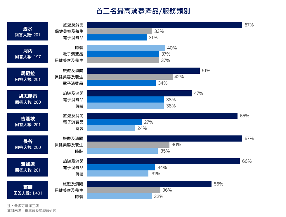 根據研究結果,東盟消費者消費最多的類別為:「消閒旅遊」、「健康美容和保健」及「電子產品」。由此可見,東盟消費者隨著收入增加而追求更高品質的生活和產品。