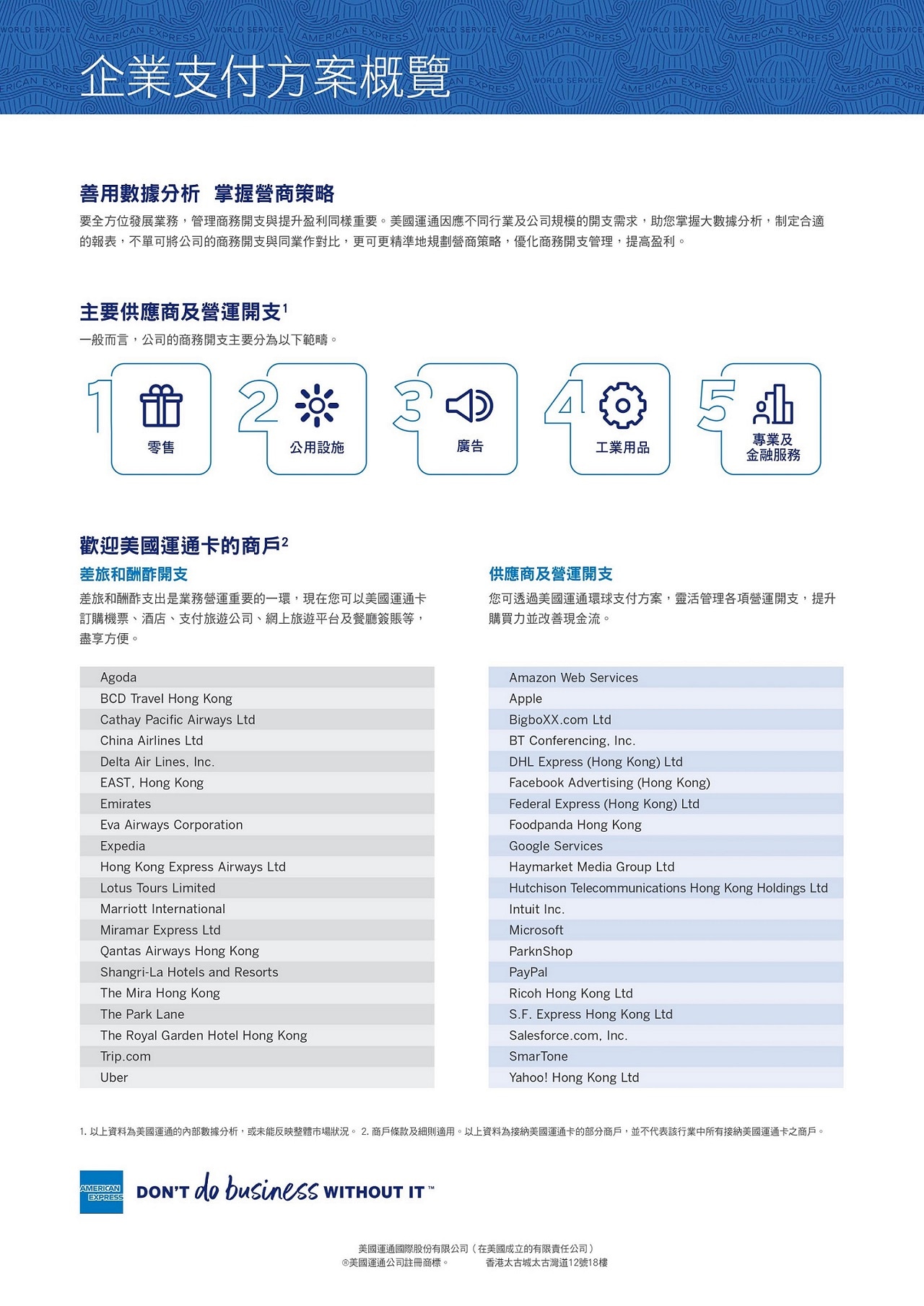美國運通公司卡或商務卡方案迎合不同行業的業務需要,提供專業的商務開支管理服務。去年超過7,000個本地新商戶加入美國運通網絡,以後不論購買辦公室用品、酬酢宴客,或到外地公幹,均可使用美國運通卡支付貨款及服務供應商,同時盡享優惠獎賞、減低業務成本。