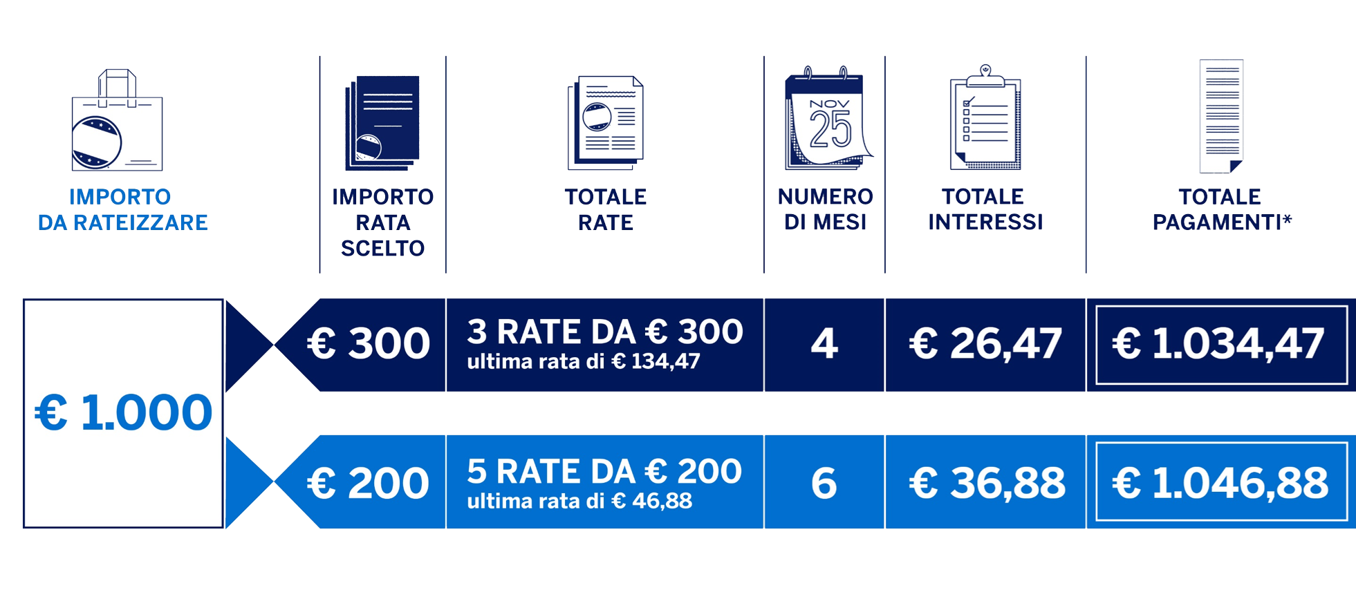 * Importo complessivo contenente: importo da rateizzare, interessi (TAN 14%) e bolli statali dovuti (€ 2,00 applicato ad ogni estratto conto con saldo superiore a € 77,47). Esempio valido se non vengono effettuate ulteriori spese con Carta nei tempi di estinzione del suddetto importo da rateizzare.