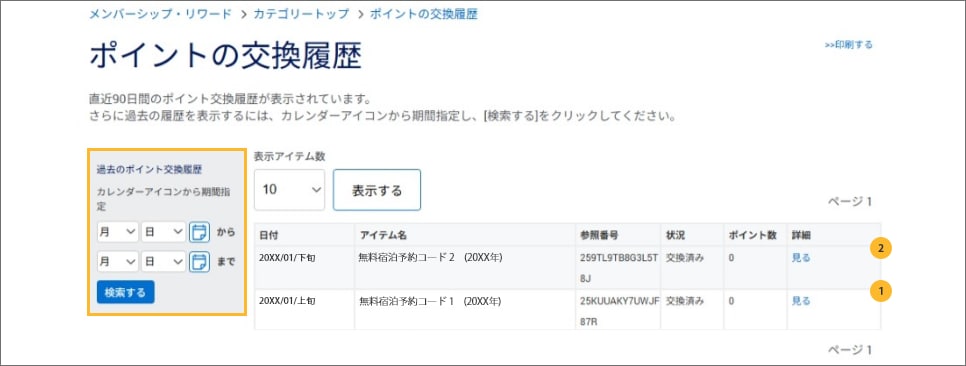 マイアカウントにログイン後、ポイント交換履歴から無料宿泊予約コードをご確認いただけます。※ 無料宿泊予約コードが表示されない場合は、期間を1月14日から12月31日に指定し検索してください。