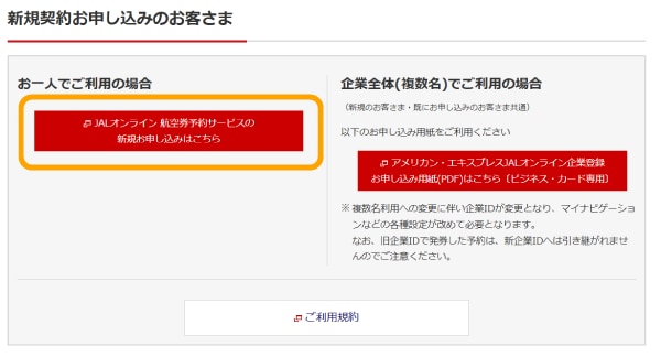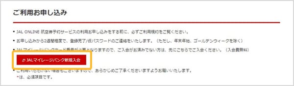 特典専用ページ内の「JALオンライン 航空券予約サービスの新規お申し込みはこちら」をクリックし、「JALオンライン」会員登録ページへ移動します。