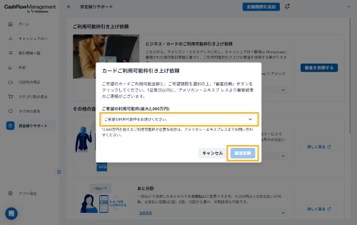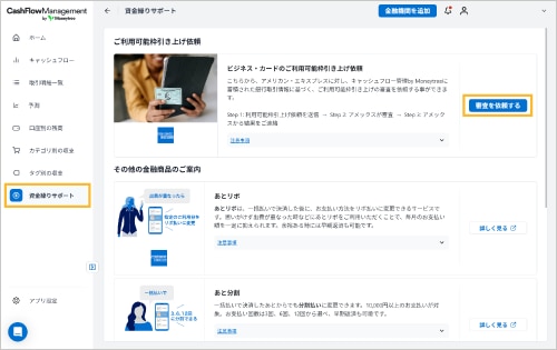 左上のメニューから「資金繰りサポート」を選択のうえ、「ご利用可能枠引き上げ依頼」エリアの「審査を依頼する」ボタンを