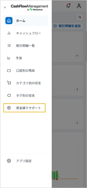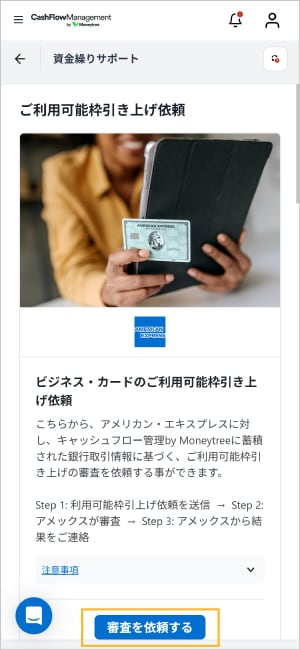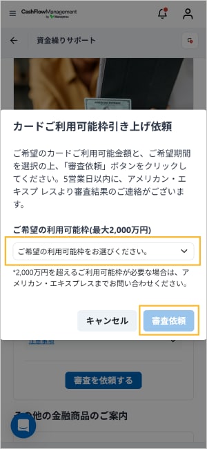 左上のメニューから「資金繰りサポート」を選択のうえ、「ご利用可能枠引き上げ依頼」エリアの「審査を依頼する」ボタンをタップしてください。