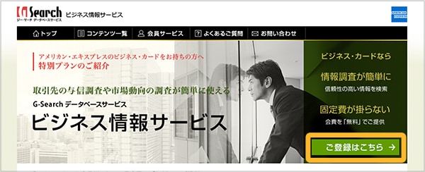 会員登録完了後、サービスをご利用になれます。「サービス・特典の登録/申し込み」ページからビジネス情報サービス「ジー・サーチ」の特典専用ページへ移動してご利用ください。