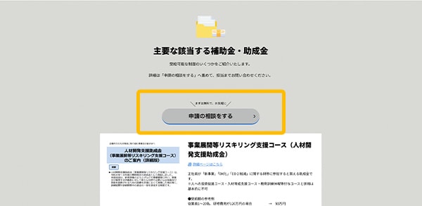 診断結果が表示されるので、希望の補助金・助成金を確認後、「申請の相談をする」をクリックしてください。