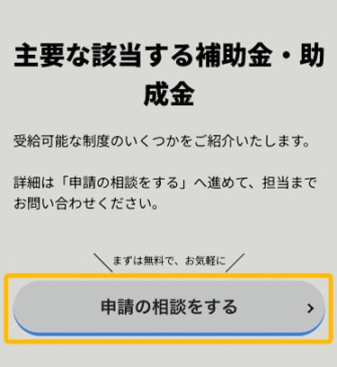 診断結果が表示されるので、希望の補助金・助成金を確認後、「申請の相談をする」をタップしてください。
