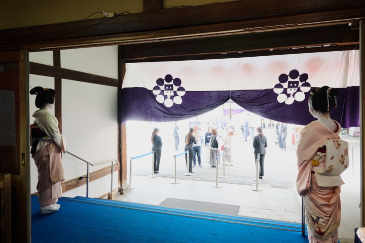 歴史ある文化財の玄関に芸妓がお迎え
